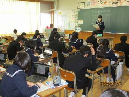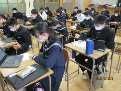 総合的な学習の時間に、「職業インタビューの発表会」をしたり、興味のある職業について、クロームブックを活用して「職業調べ」を行ったりしています。社会には数多くの職業があることを学んでいます。将来は、自分の適性や能力、興味に合った進路選択をしたいと考えている生徒が多くいるようです。