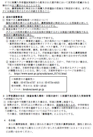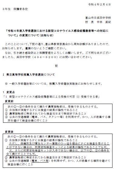 「令和4年度入学者選抜における新型コロナウイルス感染症罹患者等への対応について」の変更について、県教育委員会より周知依頼がありましたのでお知らせします。
