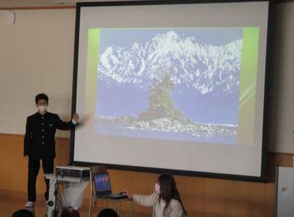 各クラスの代表者が「富山について」「身近な人」をテーマに発表しました。この日のために、昼休みや放課後の時間を使い、一生懸命練習していきました。聞いている人も引きこまれ、発表者の呼びかけにたくさんの人が答えていました。来年度も、スピーチ能力を高めていきましょう。