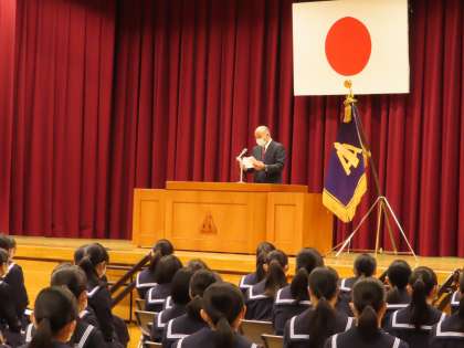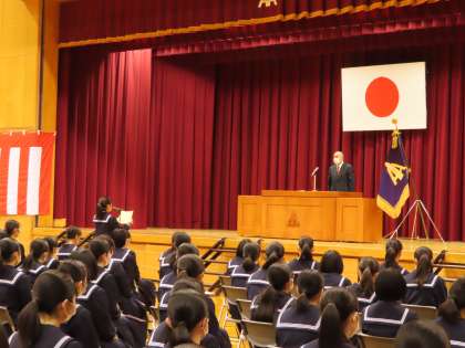 「皆さんは、毎日学校に通い、将来に向けて考え、努力してきました。学校生活の途中からは、コロナ感染症による影響を受けて、体育大会等でもできることを中心に限られた条件の中、みんなで前向きに努力しました。今年度開催された2つのオリンピックで私たちは悔し涙からもうれしい涙からも感動を覚えました。真剣に努力した末の涙だからこそ、人は感動するのだと思います。将来に向けて大きな可能性のある皆さんには、どのような時にも前向きに生きてほしいです。」