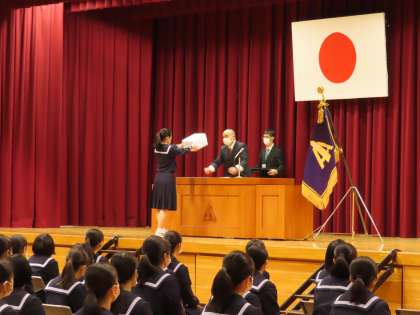 そして、卒業記念品として、印鑑とコサージュをいただきました。代表生徒は、たくさんの思い出を胸に、4月からのそれぞれの道を進んでいきたいとお礼の言葉を述べました。