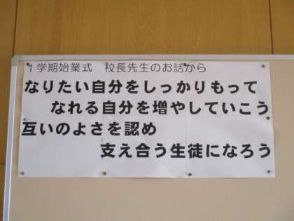 <写真>3年4組、5組、廊下に掲示されている始業式での校長先生の式辞