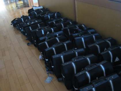 廊下に出されたかばんがきちんと並べられています。