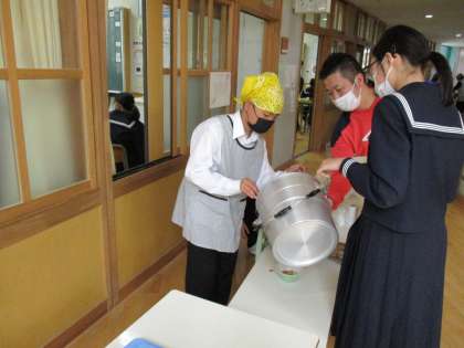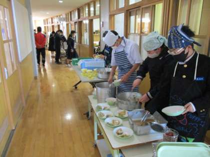 給食の準備をしています。どのクラスの給食当番も準備をテキパキと行っています。