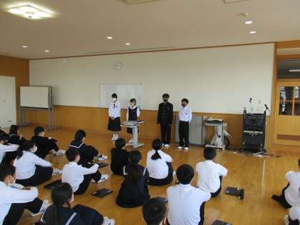 1学年の団別集会の様子です。体育大会の団リーダー候補が所信表明をしています。