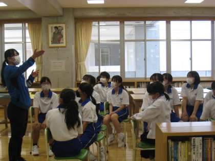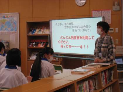 図書室の利用について学校司書の先生から説明を受けました。その後、早速興味のある本を選んでいました。