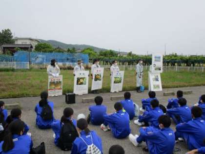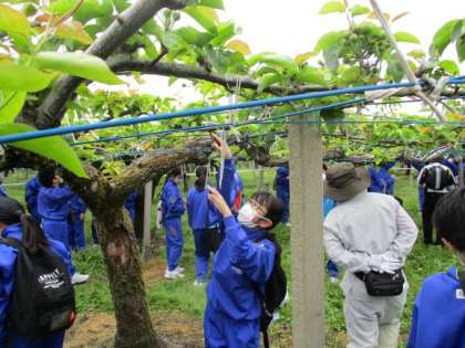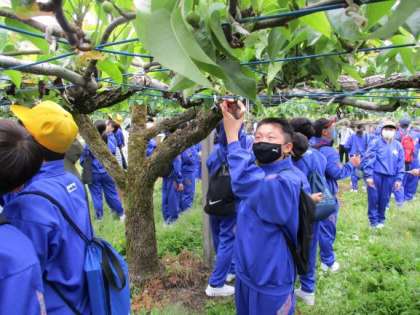 雨の心配がありましたが無事に摘果体験を行うことができました。生徒たちは摘果の説明を聞いた後、作業体験を行いました。どの実を切り落とすかを選び、楽しみながら作業していました。
