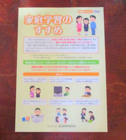 1年生の保護者様宛に、お子様を通じて「家庭学習のすすめ」(リーフレット)を配付しました。これは、学力向上の取組の一つとして、学習習慣・生活習慣の定着に向け、富山県教育委員会が作成したものです。来週からは、期末考査期間に入ります。ぜひご家庭でご活用いただきたいと思います。
