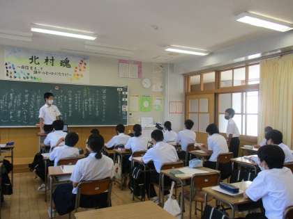 2年3組の登校日でした。写真はオススメの本を紹介し合うビブリオバトルの様子です。
