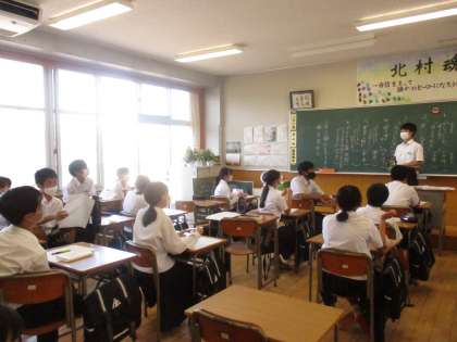 2年3組の登校日でした。写真はオススメの本を紹介し合うビブリオバトルの様子です。