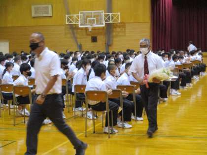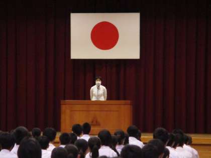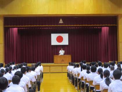 ・北信越大会や全中大会に出場した選手たち、それを応援していた生徒たちの労をねぎらい、大会に出場した選手だけでなく、呉中生の皆が、共に学び、競い合っているからこそだと称揚しました。