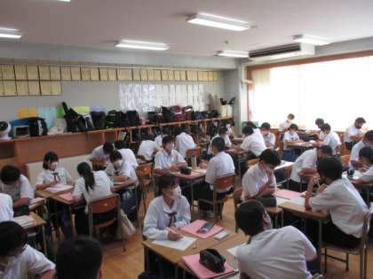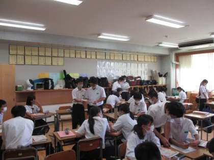2年5組でALTの先生と英語の授業を行いました。生徒一人一人が、それぞれ考えていることを英語で表現しようと、主体的に取り組んでいました。