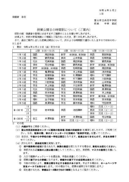 9月23日(金)授業公開日の時間割について、案内プリントを配布しました。ご確認ください。