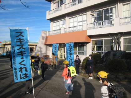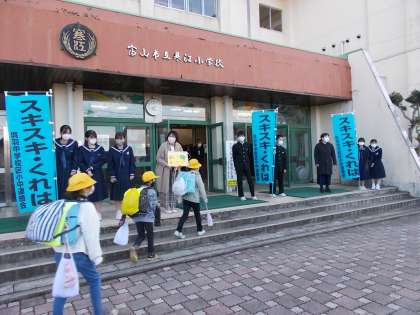 呉羽中学校区 小中連携教育推進の活動として、中学生が小学校を訪問し一緒に朝のあいさつ運動を行いました。