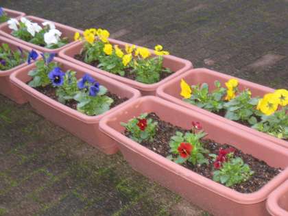 先週の金曜日に環境ボランティア委員会の生徒たちがプランターに色とりどりのパンジーを植えてくれました。