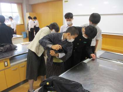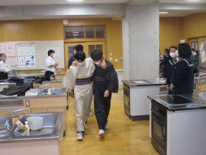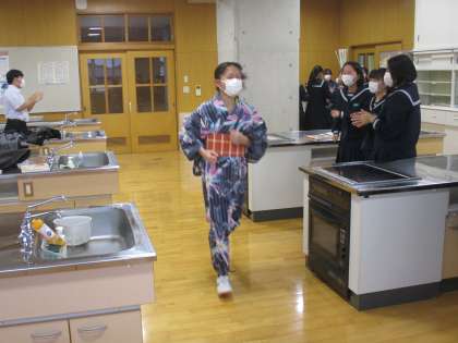 2年の技術家庭では、生徒たちが着方の説明を見て、考えながら浴衣を着ていました。浴衣を着た後は、自分たちが歩けるか試し、楽しそうな雰囲気でした。