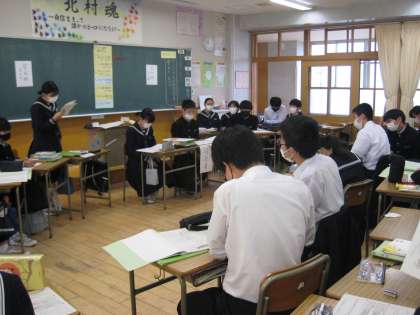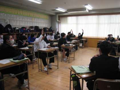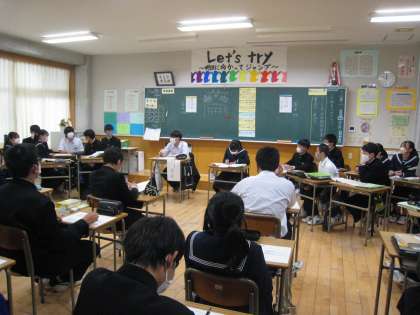 2年の国語では、ディベートの学習をしています。議論の中で、生徒たちは、自分の主張に合う根拠を探し、しっかりと意見を述べていました。