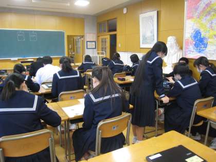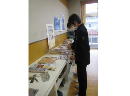 3年の美術では、マグカップのデザインを決めるため、本やクロムブックを使って資料を探していました。