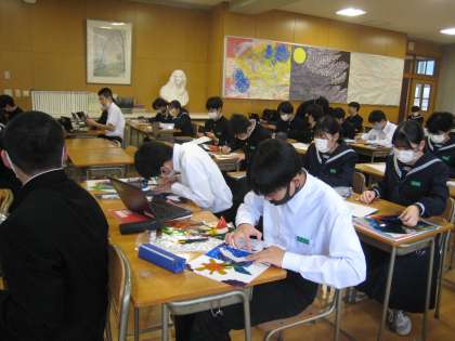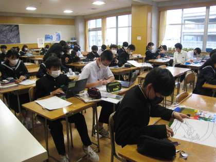 2年の美術では、台紙に下絵を描いたり、プッシュカラーで着色したりして、プッシュステンドを製作していました。
