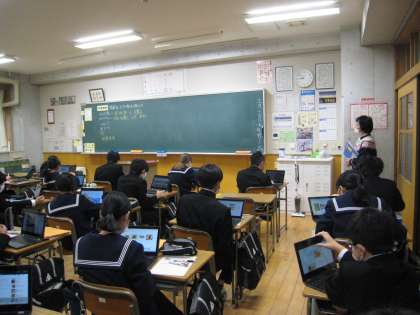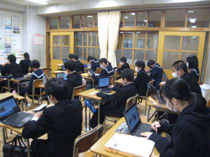 1年の技術家庭では、栄養・いろどり・盛りつけ・旬・地産地消などの条件をもとに、野菜たっぷりの献立をクロムブックで調べた情報を活用しながら考えていました。