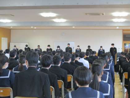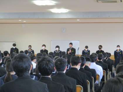 今日は2学期最後の学年集会でした。前半は学年生徒会が今学期の自分たちの良かったところを発表しました。1学期から続けられたこと、今学期達成できたことは3学期にもつないでいきましょう。また、後半は先生方から学習面・生活面への話がありました。中学校最後の冬休みをどう過ごしますか?入試まで残りわずかの人もいます。県立入試までも76日と日数を聞いて驚いた人もいたと思います。受験生としての自覚をもって、息抜きもほどほどにできることをしていきましょう。明日もう1日頑張りましょう。