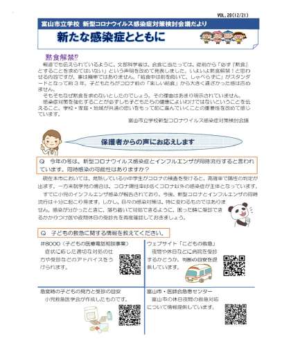 先日配付しました 富山市立学校新型コロナウイルス感染症対策検討会議VOL.20 です。