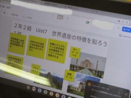 クロムブックを使って、世界遺産について調べ、班ごとの発表資料を作っています。