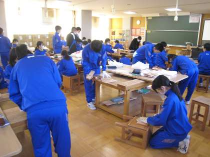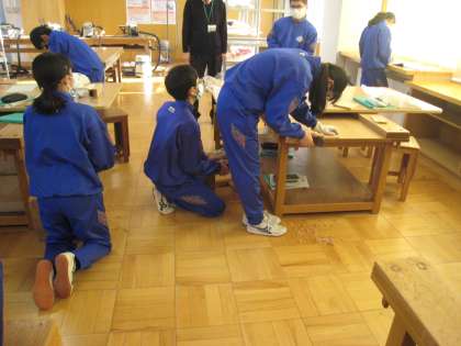 1年の技術家庭では、のこぎりで切った木材に、かんなをかけて、木材の断面を平らにしていました。