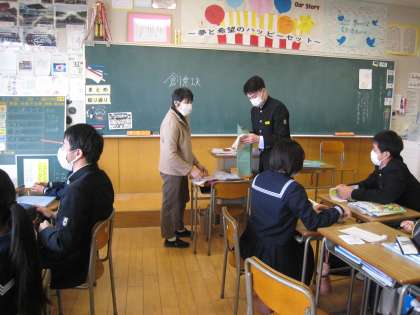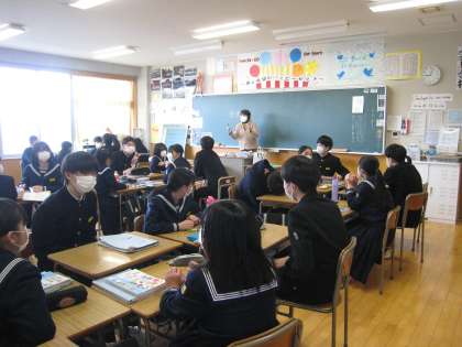 3年の技術家庭では、「お世話になった方へのプレゼント」として、何をどんな布で作るか、班で相談しながら考えていました。