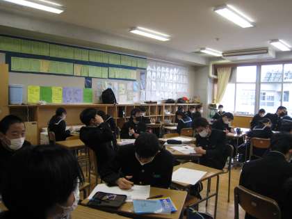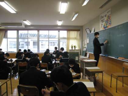 2年の数学では、生徒が入試問題を解いて自己採点したあと、解説を聞いて理解を深めていました。
