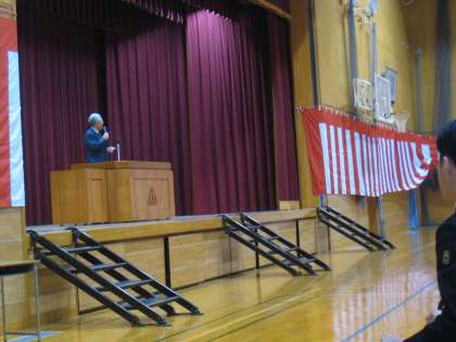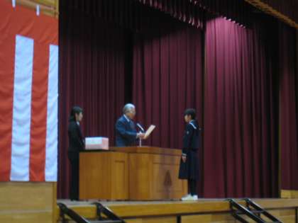 その後、同窓会の世話役となる学年委員を紹介し、代表に委嘱状、記念品として卒業証書ホルダーをいただきました。代表生徒は、今後、同窓会の一員として自覚と責任をもって行動するという力強い入会の言葉を述べました。最後に、3年間元気に通学し続けた生徒に皆出席賞を手渡していただきました。