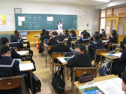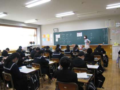 1年の英語では、生徒たちが授業を受ける時の持ち物やきまりについての話を真剣に聞いていました。