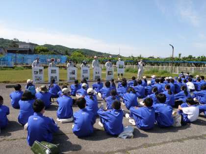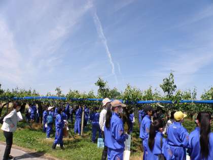 晴天の中、梨の摘果作業体験学習を実施しました。