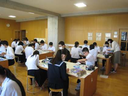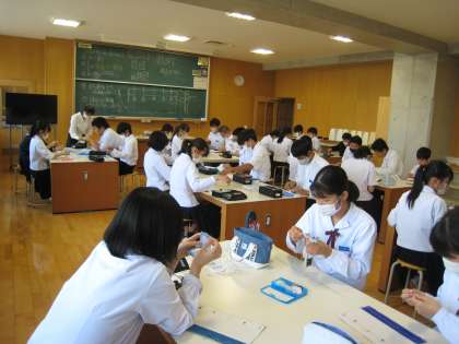 2年の技術家庭では、ティッシュケースを作るために、2枚の布を縫い合わせていました。