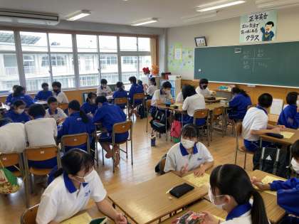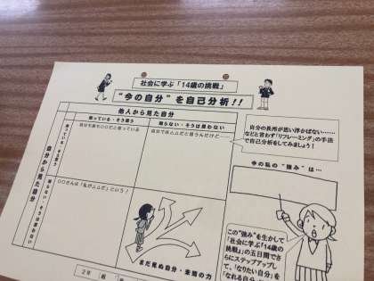 1限学活では、14歳の挑戦に向けてワークシートを用いて自己分析をしました。