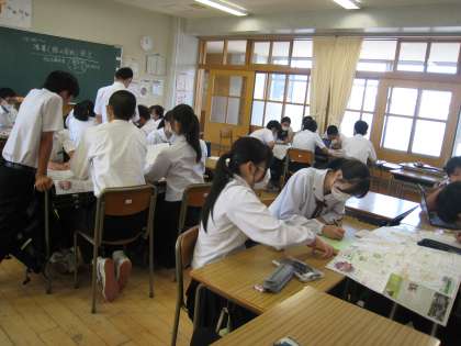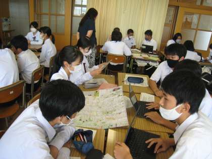 3年の学活では、地図を広げて、修学旅行で見学したい所を班ごとに相談していました。
