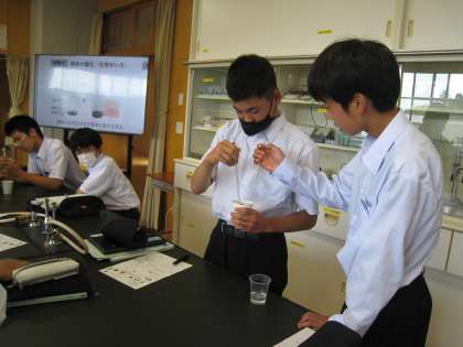 2年の理科では、「化学変化による温度変化」の実験で、鉄粉に食塩水を混ぜて温度が高くなることを確かめていました。