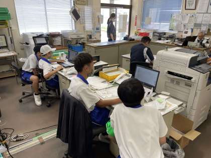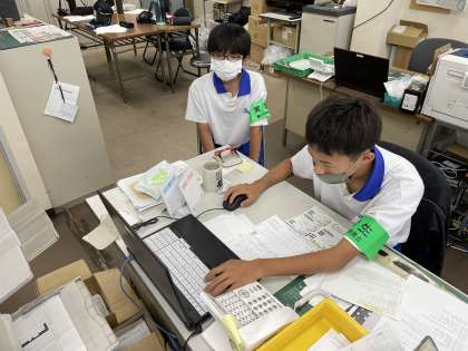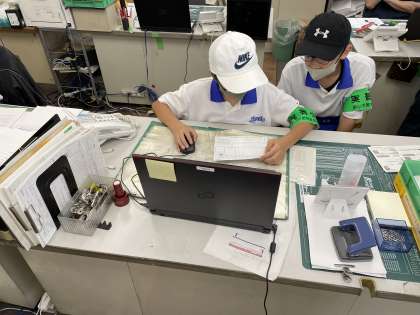 富山倉庫呉羽営業所での様子です。このとき、生徒たちは荷物の配送伝票をパソコンで作成していました。練習用ではなく、本物の伝票だそうです。デスクワークも大切な仕事ですね。