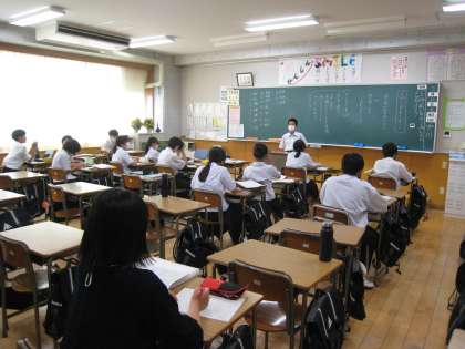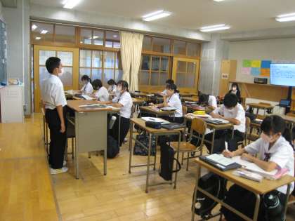 1年の国語では、生徒自身がつくったスピーチ原稿を発表していました。話すスピードや一文の長さに気をつけて、分かりやすく伝える工夫をしていました。