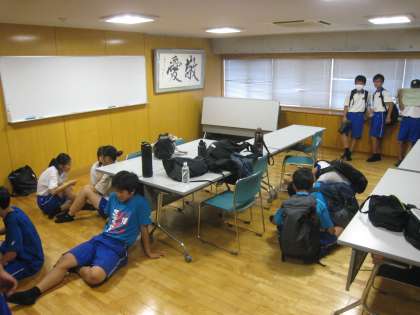 部活動終了後、エアコンの効いている部屋でクールダウンをしています。体調を整えてから、安全に帰宅しましょう。