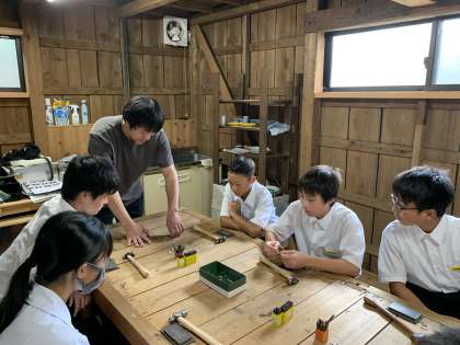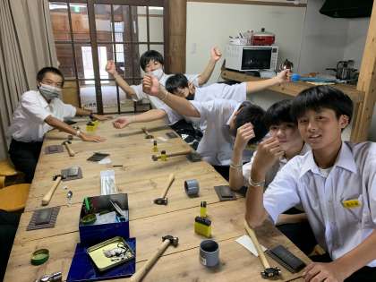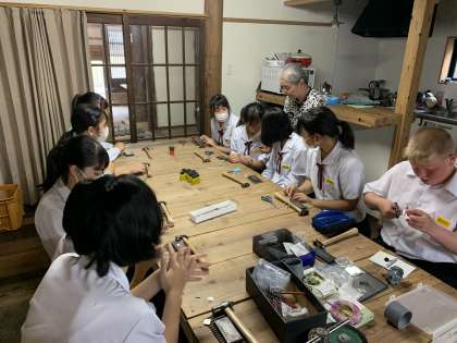 1組は、大寺幸八郎商店にて錫アクセサリーづくり体験を行っています。