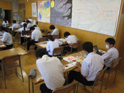 2年の美術では、自分が作成したデザイン画に着色をしていました。