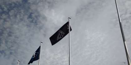 晴天に恵まれ、県駅伝大会が開会しました。競技場には、呉羽中校旗がたなびいています!