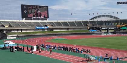 晴天に恵まれ、県駅伝大会が開会しました。競技場には、呉羽中校旗がたなびいています!