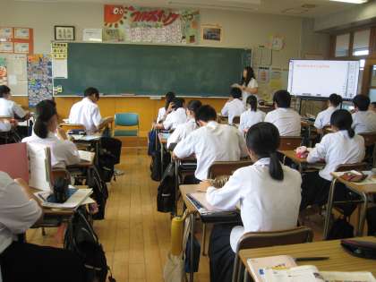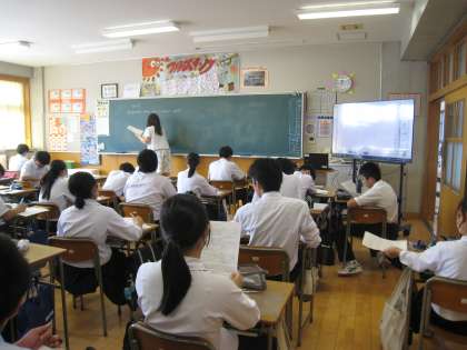 3年の英語では、動画を視聴し、続いて英文を音読していました。その後、プリントを使って長文読解に取り組んでいました。