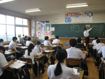 3年の理科では、学習課題「なぜ、斜面では一定の割合で、時間とともに速さが速くなるのか」について、生徒たちが活発に意見を出し合っていました。