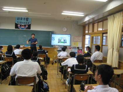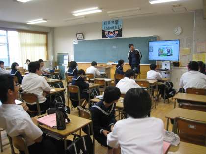 2年の英語では、ALTの先生の質問に答える形式で英会話に取り組んでいました。