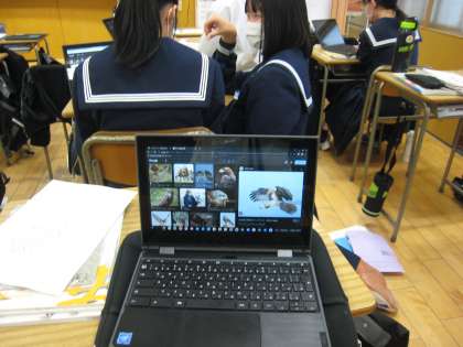 2年の美術では、銅版レリーフ製作のための下絵を描いていました。クロムブックを使って調べたり、友達と相談したりして作業を進めていました。