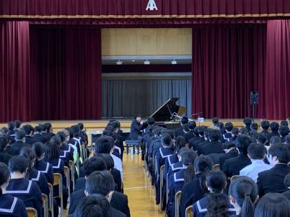 本日、ピアニスト・作曲家であるYOUTAさんの講演会を行いました。オリジナル曲全10曲を披露していただくとともに「夢をあきらめない」というメッセージを呉中生にしっかりと伝えていただきました。たいへん素敵な時間を過ごすことができました。YOUTAさん本当にどうもありがとうございました。