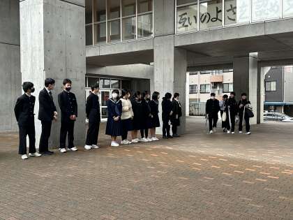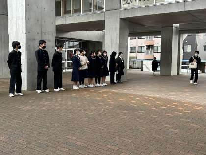 朝、生徒玄関前にて生徒会・PTA合同挨拶運動を実施しております。